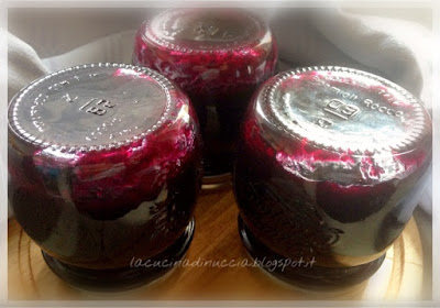 Nel frattempo ho sterilizzato i vasetti. Io l'ho fatto con il microonde, che è il metodo più veloce. Ho messo i vasetti lavati e riempiti per 3/4 di acqua, nel microonde e ho azionato alla massima potenza per circa 3 minuti (o comunque lasciateli fin quando l'acqua non arriva a bollore). Li ho estratti dal forno (con delle presine, attenzione sono bollenti!) e ho eliminato l'acqua in essi contenuta. I tappi, che sono in parte metallici, non vanno nel microonde ma se li utilizzate nuovi (come è consigliato), li lavate molto bene e asciugate con un panno pulito, seguendo la procedura che vi indico sotto, saranno comunque sicuri. Prima di spegnere il fuoco mi sono assicurata che la consistenza fosse quella giusta con la prova del piattino. Cioè prendendo un cucchiaio di confettura e versandolo in un piattino asciutto e pulito. Quando la confettura non scivola velocemente inclinando da un lato il piatto ma si "aggrappa" un pochino allora è pronta! Ho invasato subito nei vasetti ancora bollenti e li ho chiusi bene, senza stringere troppo. Appena chiusi i vasetti li ho rovesciati su una superficie pulita e tiepida e ho lasciato raffreddare in questa posizione.